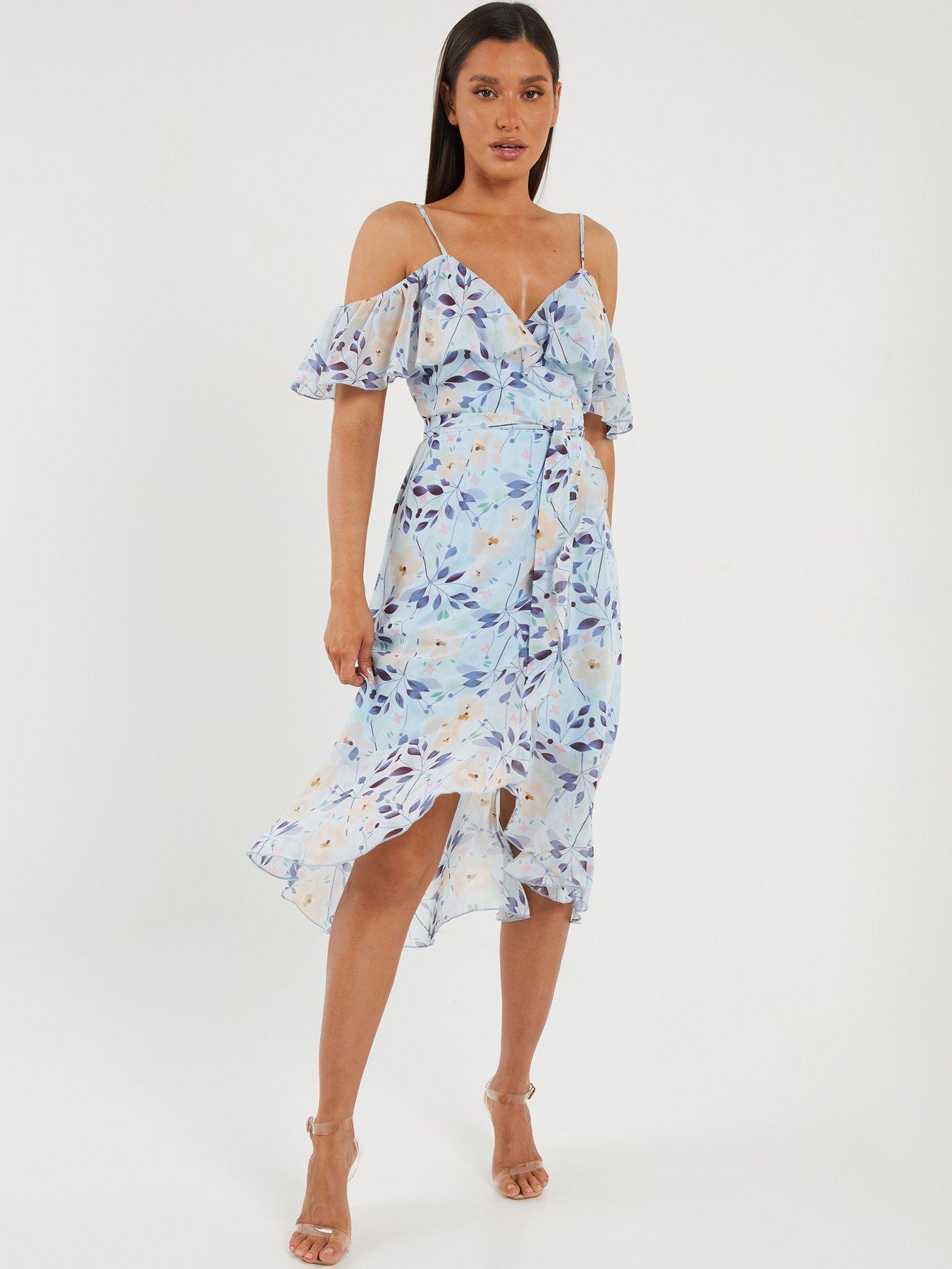 Quiz Floral Chiffon V Neck Cold Shoulder Midi Dress Light Blue Very Co Uk